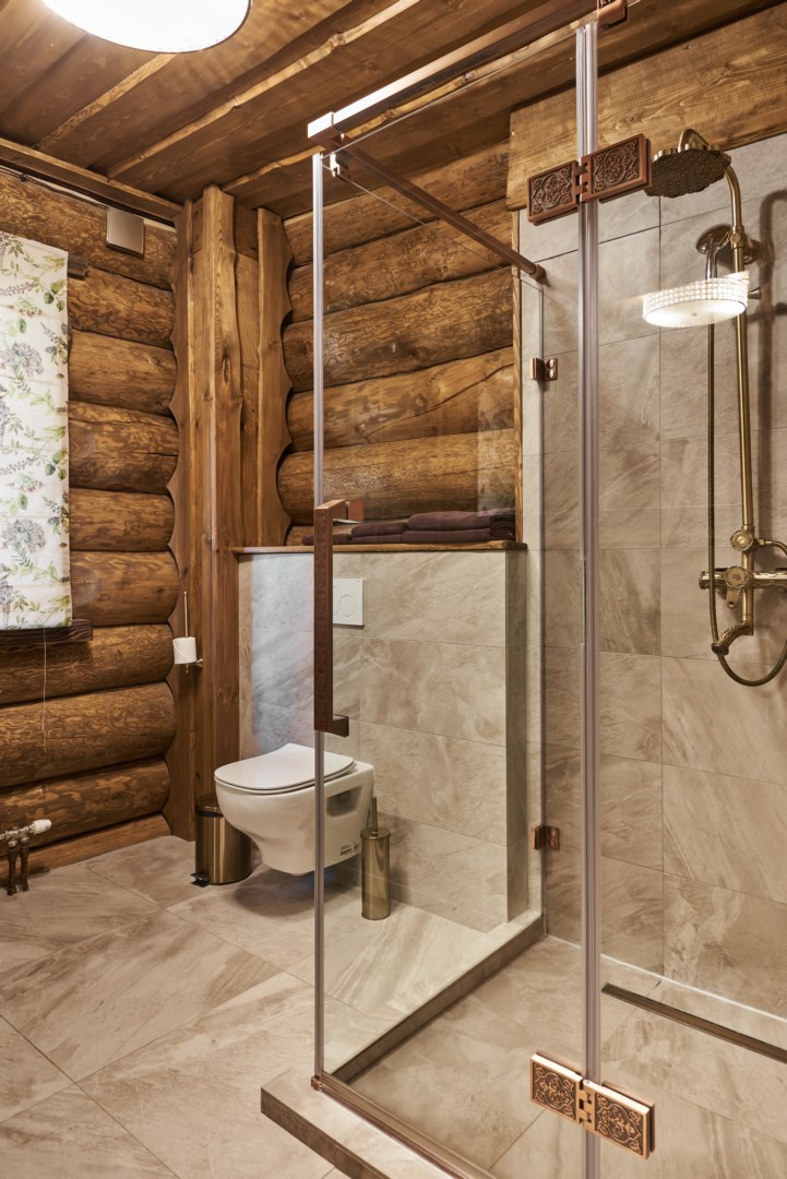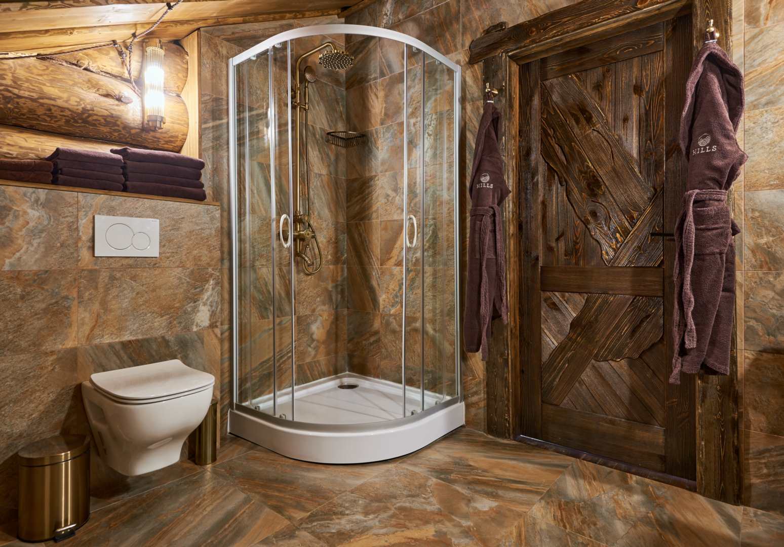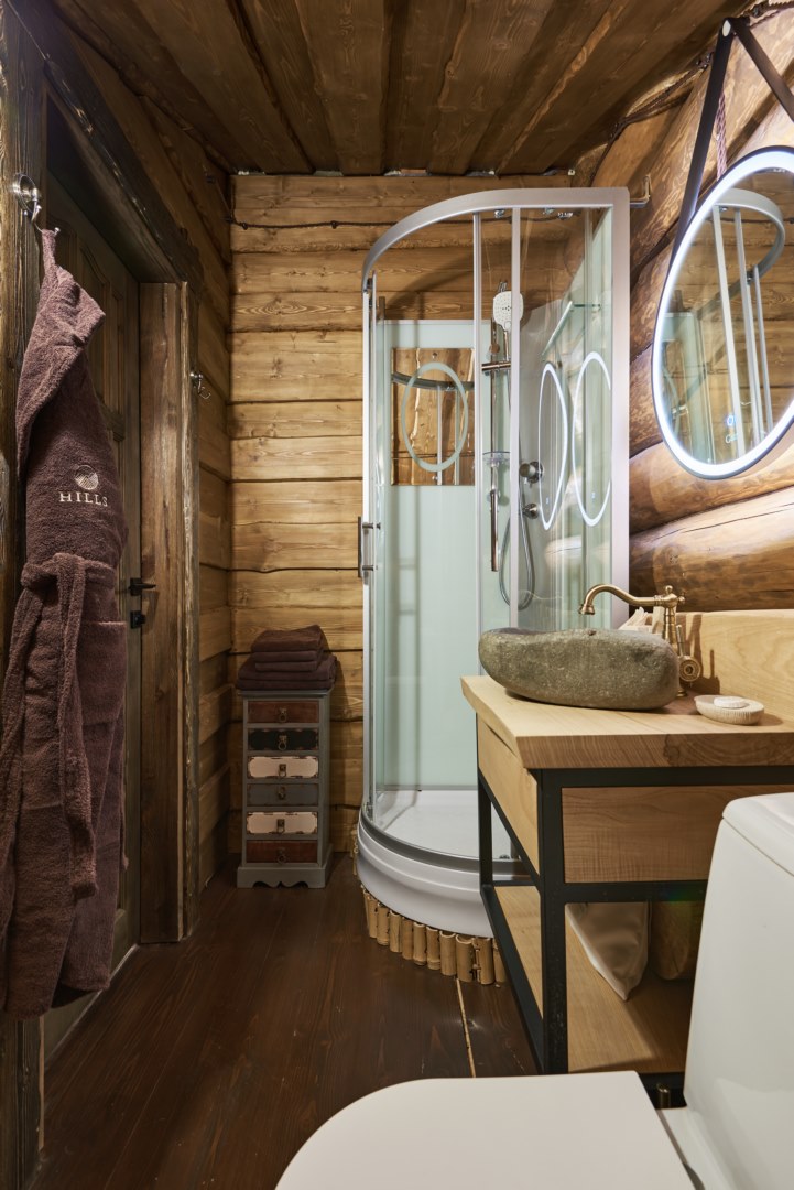 Каждая спальня имеет индивидуальную ванную комнату, которая оснащена душевой кабиной. Для удобства в ванной комнате имеется фен и косметические принадлежности: шампунь, кондиционер, гель для душа, мыло, косметический набор. Для Вашего комфорта для каждого гостя есть махровый халат и мягкие тапочки.